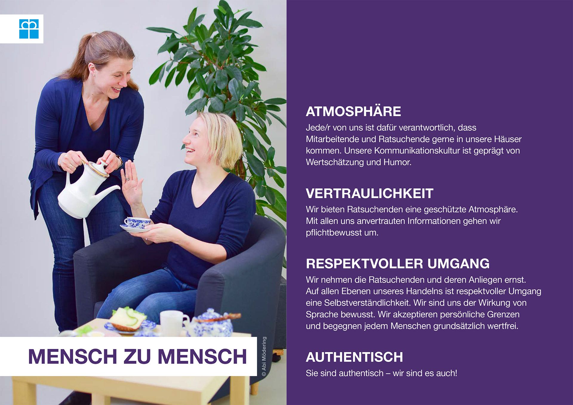Wir beraten Sie von Mensch zu Mensch, sinnstiftend und kompetent. Sie finden bei uns eine geschützte Atmosphäre vor, die geprägt ist von Respekt, Wertschätzung und Humor. Alles, worüber wir sprechen, behandeln wir selbstverständlich vertraulich.